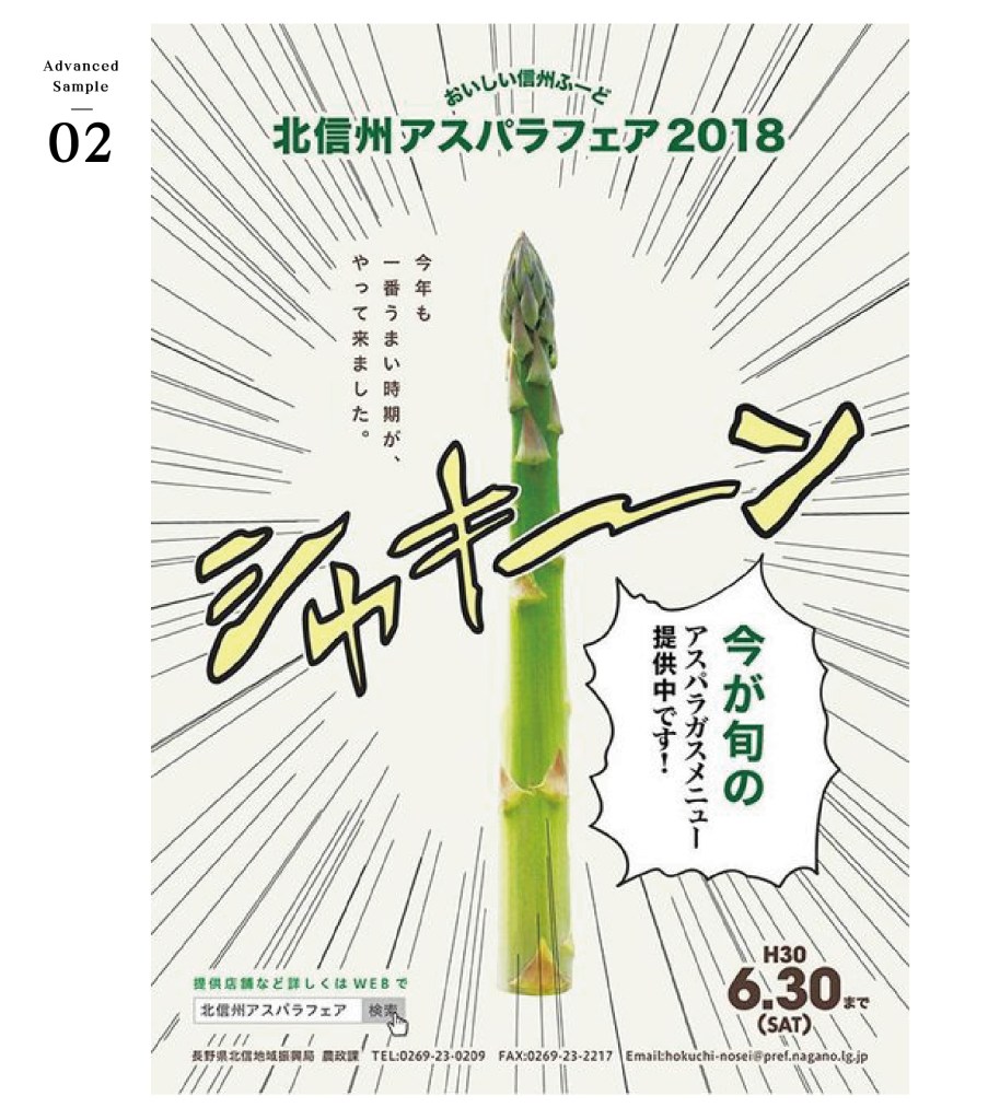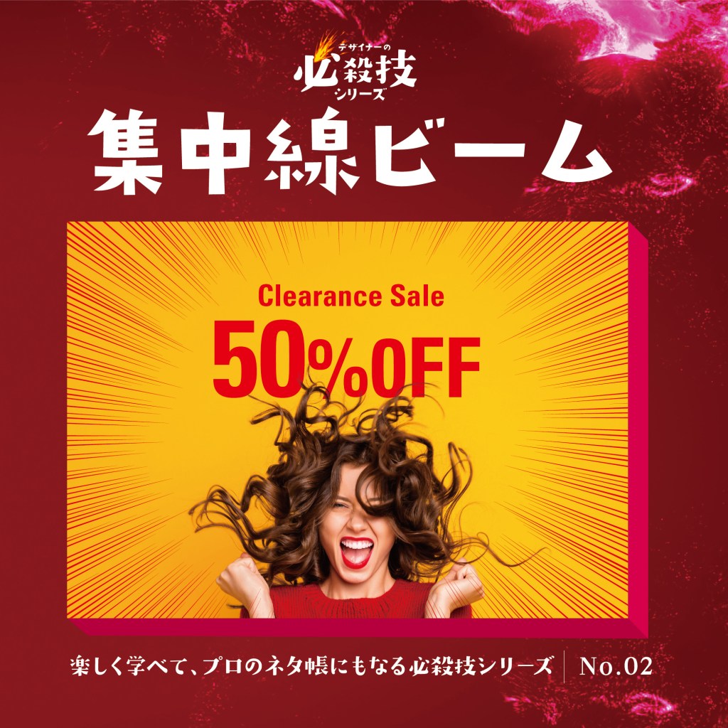 ここを見て!とばかりに線を集中させる『集中線ビーム』は見る人を否応無しに線の先に導きます。元々は漫画で使用されている描写テクニックですが、近年において、とても使い勝手がいいので、セールスプロモーションデザインだけでなく、求人広告など様々なシーンで活用されています。